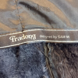 Black straight-fit warm jacket with a faux leather exterior and faux fur lining. No size label or fabric/care tag. The brand, Tradong (or Fradong) by Sam Mi, is printed on the lining. Although information on this brand is limited, the jacket appears to be well-made.