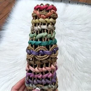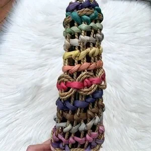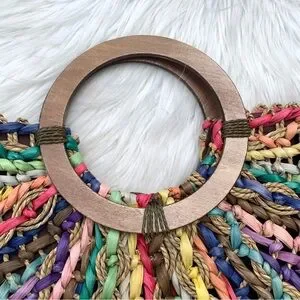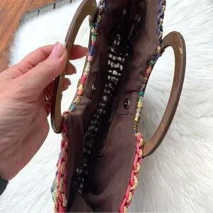 Vintage T. Cappelli Colorful Boho Straw Woven Bag Round Wooden Handle