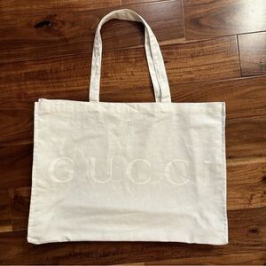 Elegant white canvas tote bag with Gucci logo. Perfect for everyday use and is a spacious accessory perfect for travel. Featuring the iconic embossed logo monogram. Reusable cotton Gucci tote. It’s new but since it’s white, I’m listing it had great condition since it may have a spot that I missed even after careful inspection. Please ask questions. It’s pretty big so see measurements.