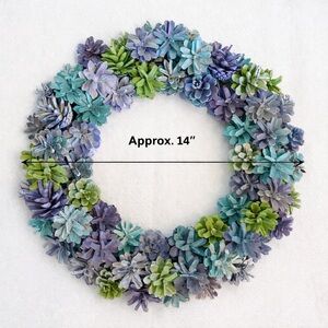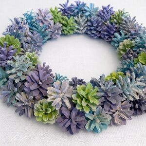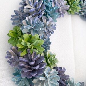 Beautiful handcrafted pinecone wreath in soft blue, green & lavender tones. Farmhouse, cottagecore, or coastal décor. Lightweight and easy to hang.