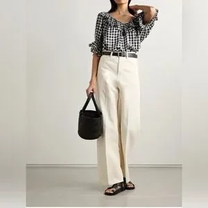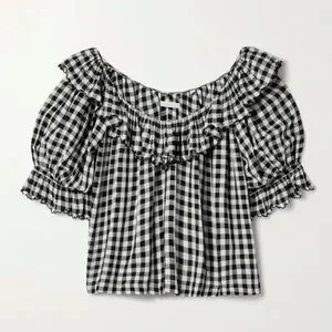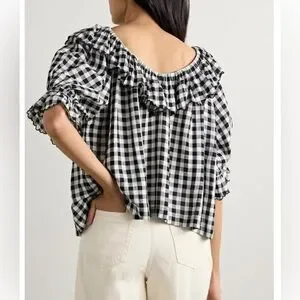 “DÔEN's Samara blouse is patterned with a gingham motif that enhances its retro feel. Made from airy voile, it has playful ruffles tracing the neckline and puffed sleeves.”