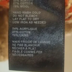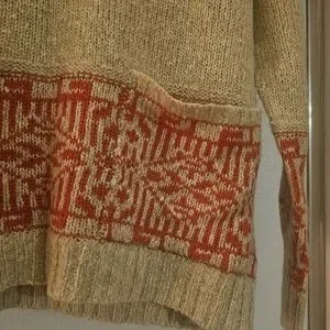 Cozy crew neck sweater by Ecote. Features a beige base with red patterned accents. Includes front pockets for added style.