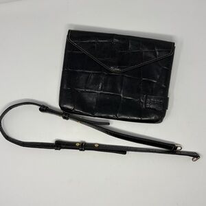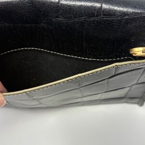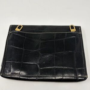 Chic and versatile Staud Holly convertible shoulder bag in black croc-embossed calfskin leather. Features tonal burnished edges, white contrast stitching, and gold-tone hardware. Includes a detachable and adjustable leather strap with post-stud fastening, fold-over flap with magnetic closure, six interior card slots, one note slot, and a tonal suede lining.