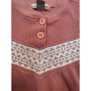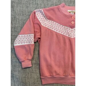 This vintage women's sweatshirt in size medium features a pink color with a Fair Isle pattern, perfect for those who love 90s skiwear style. Made from a comfortable cotton blend jersey fabric, this pullover sweatshirt has long sleeves, a crew neck, and a graphic print design that adds a nostalgic touch. Ideal for activewear, this sweatshirt is both stylish and functional, making it a great addition to any wardrobe for those who enjoy skiing or just love a retro vibe.