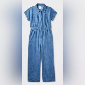 Cat & Jack girls adaptive short sleeve jumpsuit, medium wash XL(14), short sleeve jumpsuit with adaptive features,medium-wash cotton denim fabric, collared neck, full elastic waistband.