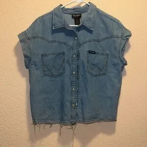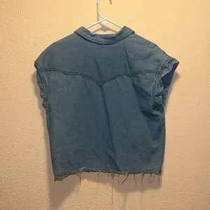 Stylish blue denim shirt with button front. Features sleeveless design and frayed hem.