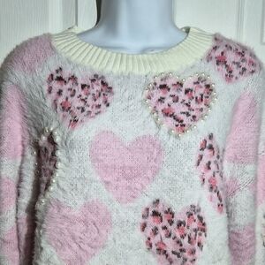 Cozy up in this charming pink leopard and white sweater featuring a delightful heart pattern with pearl outlining some of the hearts. Super soft fabric, feels just as soft on the inside of sweater as it does on the outside. Hearts and pearls vary in size, shape and spacing. Perfect for adding a touch of warmth and style to your wardrobe. Perfect for Valentines or romantic outings or just showing your love this winter. NWOT