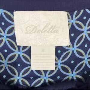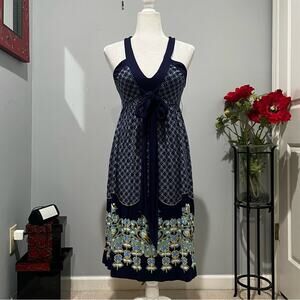 Gorgeous Boho Deletta x Anthropologie Empire Fit and Flare Plunge Neck Halter Criss Cross Back Belted Tie Waist Textured Patterned Floral and Geometric Mixed Print Sleeveless Midi Dress. Navy Blue. This Dress Has A Slightly Lofted and “Fuzzy” Over Washed Texture. Lightweight, Airy, and Comfortable. Some Stretch. Size Small.