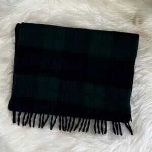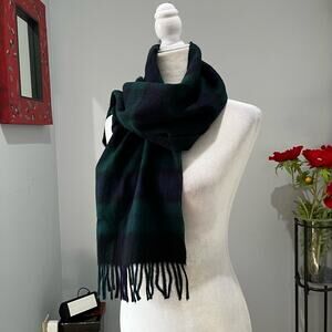 New VNTG Fraas International Trading GmbH Signatories Plaid Merino Wool Oblong Fringe Scarf in Navy Blue and Green. 11” x 55”