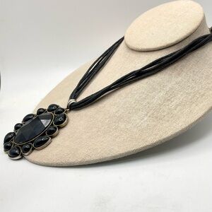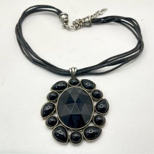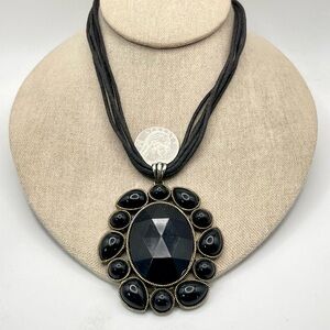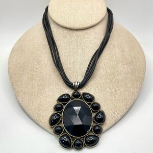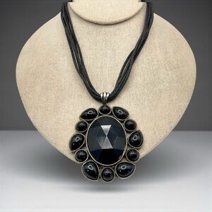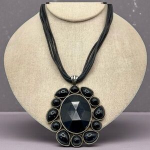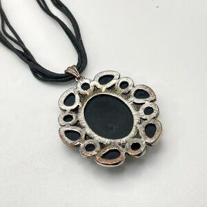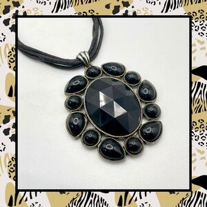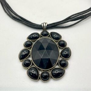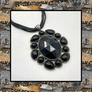 For your consideration is a black pendant necklace. It features a large oval shaped pendant with a faceted acrylic center surrounded by round and teardrop shaped cabochons. The metal is textured silver tone. A 5 strand cord necklace completes the design. It’s a bold striking statement piece.