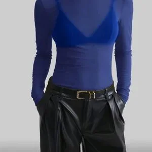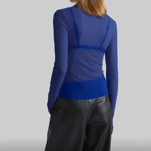 Elevate your style with this chic blue mesh turtleneck top. Perfect for any occasion, it offers a sleek and modern look.