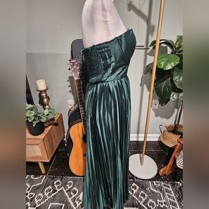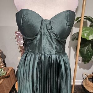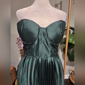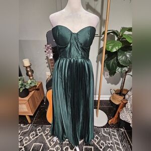 VICI Leanna Strapless Bustier Satin Pleated Maxi Midi Dress.Emerald Green.S NWOT