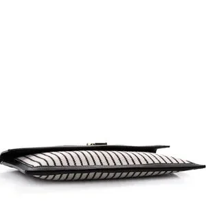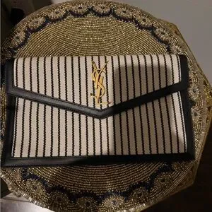Yves Saint Laurent Uptown Canvas Striped Clutch Cream Black YSL Gold Hardware