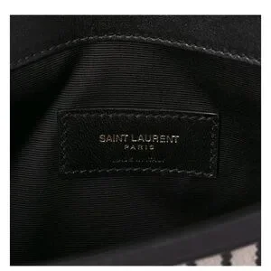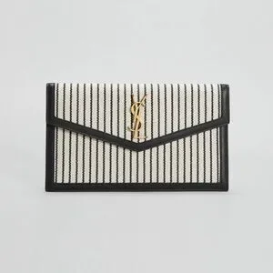 A timeless and sophisticated piece from Saint Laurent, this Uptown clutch is crafted from durable striped canvas with sleek black leather trim. The structured silhouette features the iconic gold YSL logo on a V-shaped flap, offering a refined yet modern look that transitions effortlessly from day to night.