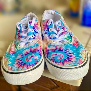 Colorful tie-dye Vans sneakers. Features blue, pink, and yellow. Ideal for casual wear.