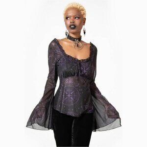 Crafted from soft stretch mesh, it features flared sleeves, a ruffled neckline with tie detail, and a compass-style star graphic in violet tones.