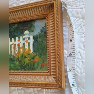 Charming custom gold framed oil painting on copper of a garden with poppies and a white pocket fence.