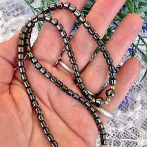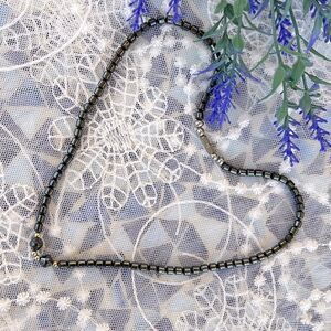 Vintage hematite beads mix with gold tone beads at the center for a subtle focal point. Old school - 80’s? Strung on fishing line.