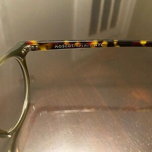 Moscot Frankie eyeglasses, olive front with tortoise temples.