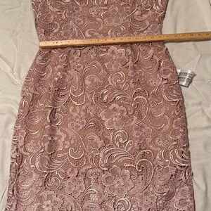 Chic midi dress with intricate lace design. Features a soft mauve color. Ideal for special occasions. Measurements included in photos.