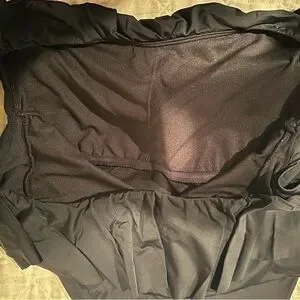 Chic black swimsuit with ruffle detail. Off-shoulder design. Ideal for style. No tags