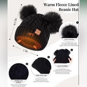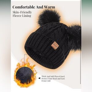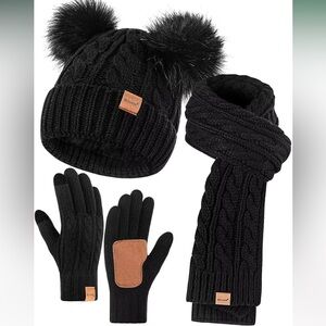 Stylish black knit set with hat, scarf, and gloves. Features faux fur pom-poms and leather accents.