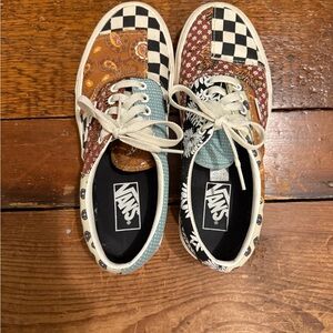 Vans sneakers with vibrant patchwork design. Features paisley and checkered patterns. Eye-catching and stylish.