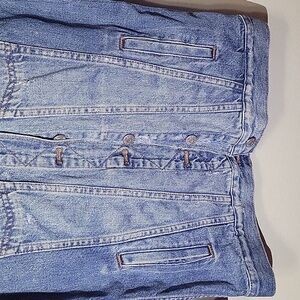 Chic denim jacket with distressed details. Features button closures and front pockets. Ideal for casual wear.
