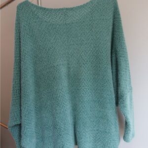 Cozy and stylish teal sweater perfect for any occasion. Soft fabric ensures comfort all day long. No size on tag but same size as an average medium sweater. Slouchy sleeve look.