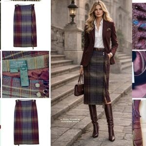 * The Lauren Ralph Lauren skirt is a sophisticated piece made from luxurious lamb's wool, showcasing a beautiful plaid/tartan pattern.