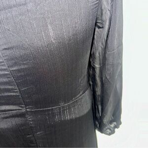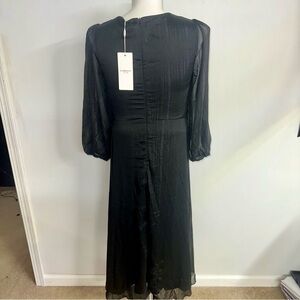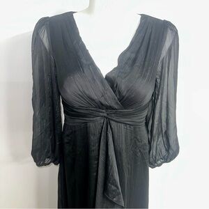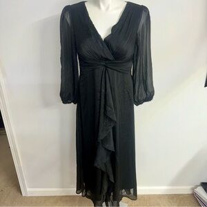 This elegant black gown features a sophisticated V-neckline and 3/4 bishop sleeves, perfect for cocktail events or as a wedding guest. The ruffled, tiered design adds a touch of romance, while the flowing skirt creates a graceful silhouette.
