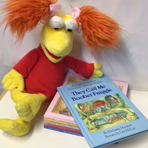 Adorable yellow plush toy wearing a red shirt, it's Red Fraggle from Fraggle Rock. Comes with a set of colorful children's books. Red Fraggle & a bunch of Fraggle books vintage Fraggle Rock set collectible toys