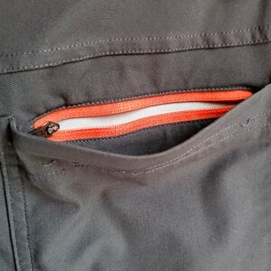 The pants come in a size 30 with a corresponding inseam of 34 inches, providing a tailored fit that flatters and streamlines your silhouette. Features like the flat front, mid-rise, and straight leg contribute to their slimming effect, while the multiple pockets offer practical storage. Machine washable for easy care, these pants combine functionality with style seamlessly. In excellent used condition.