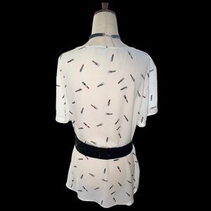 Elevate your style with this chic sheer white top featuring a delicate lipstick 💄 print. Perfect for any occasion, this top offers a blend of comfort and elegance. Fun and quirky choice. EUC