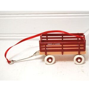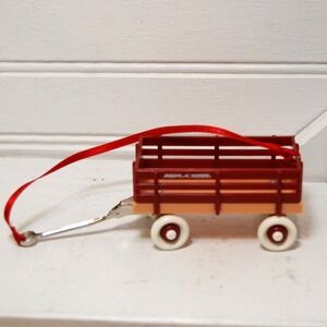 Adorable, miniature Radio Flyer classic red wagon ornament. In great condition. No visible defects. Measures about 5x2x2 inches. Has a thin red ribbon tied to the pull handle and the back of the wagon. Wheels rotate when pulled.