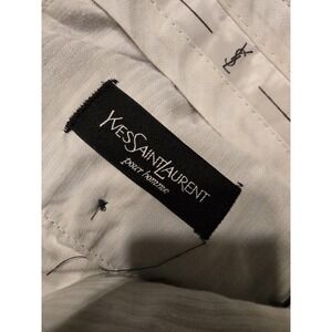 The Yves Saint Laurent Pleated Dress Pants in gray are versatile and sophisticated, suitable for a variety of occasions from casual to formal. These pants feature a zip closure, slash pockets, and a straight leg style with a cuffed hem. Made of a blend of polyester and rayon, they offer a comfortable fit for all seasons. The high-waisted design and preppy theme make them a stylish choice for the modern man looking for a touch of luxury in their wardrobe.