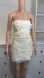 Cream strapless mini dress with delicate floral appliques and a sheer tulle overlay. Features a ruched waistband detail and a side zipper closure.
