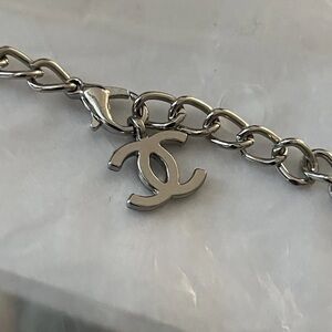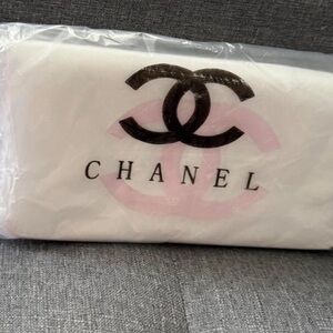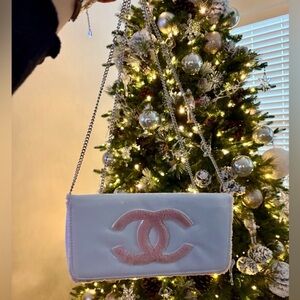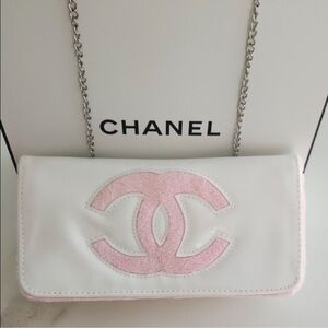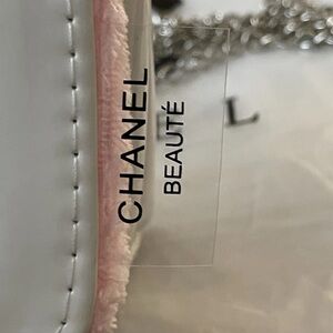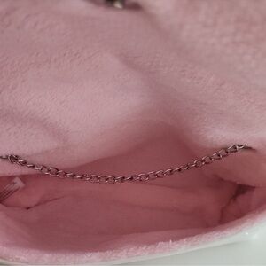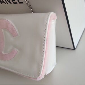Shoulder with white patent leather and soft Teddy Bear Barbie pink CC logo. The chain is solvent and it's removable. 10 in x 6 in x 2 in