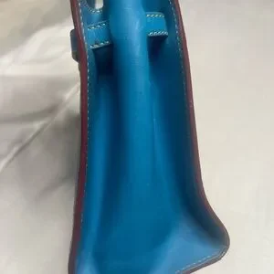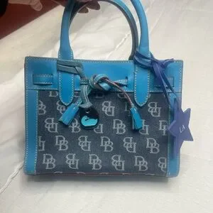 Chic denim satchel with vibrant blue leather trim. Features signature DB pattern. Ideal for daily wear.
