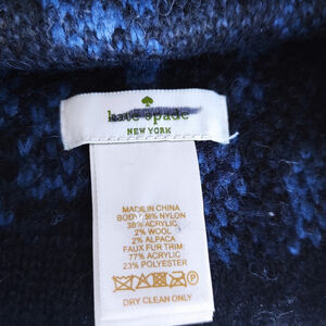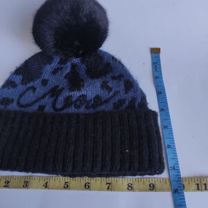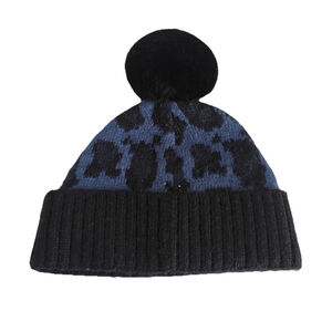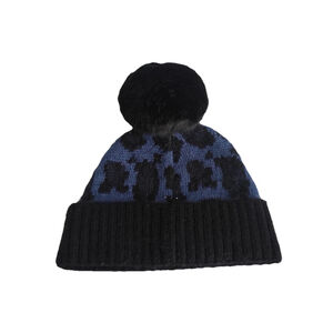 Authentic Kate Spade New York knit beanie featuring a soft blue and black pattern with an oversized faux fur pom. Warm, lightweight, and comfortable with a stretch fit that works well for everyday winter wear.