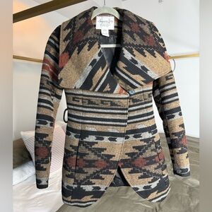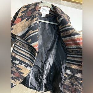 Saddle up in this beyond iconic American Rag southwestern print blazer: a wearable piece of vintage Americana with modern Y2K energy. Features a rich desert-toned palette, bold tribal-inspired pattern, tailored silhouette, and that it girl tailored blazer fit size XXS.