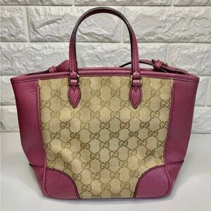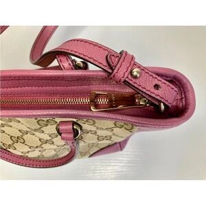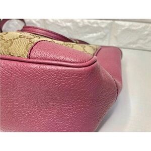 Stylish Gucci tote with pink leather accents. Iconic beige monogram canvas. Perfect for everyday elegance.