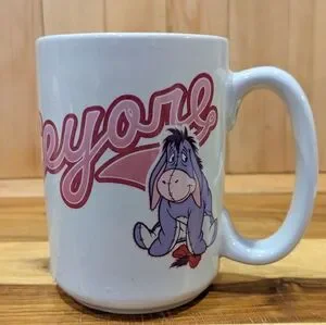 Charming Disney mug featuring Eeyore. Pink lettering on a white base. Perfect for fans.
