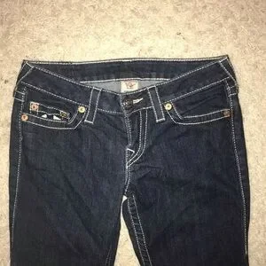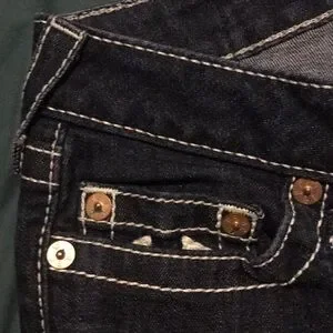 Great straight leg jeans. Dark wash with the logo on pockets tan. Very nice . Inseam 27 in Ankle Cropped depending on how tall you are.