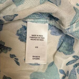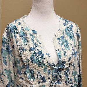 Chic floral blouse with a v-neckline. Features blue and white tones. Ideal for casual wear.