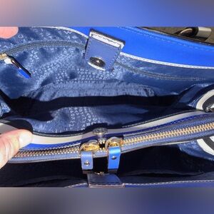 Kate Spade, Kate Spade New York, striped bag, blue satchel, crossbody tote, colorblock bag, handbag, coated leather, summer bag, spring tote, bold stripes, designer purse, shoulder bag, satchel purse, chic tote, preppy style, gift idea, nautical style, everyday handbag, red white and blue, 4th of July, holiday gift for her, Christmas gift