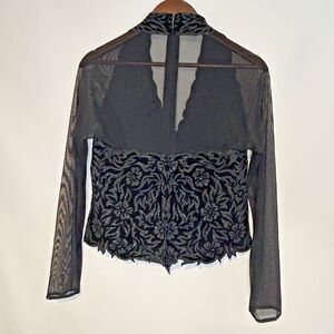 Tadashi Vintage Black Velvet Beaded Formal Top Mesh Sleeves XL Stretch Elegant