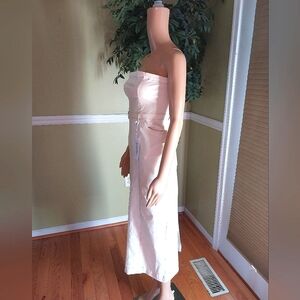 Indigo Rein Denim Strapless Dress, NWT, Size M, cream, thick denim, new with tags, front pockets, back pockets, zips up back, slit up back, cotton spandex blend material, machine washable, arm pit to arm pit 16", waist seam to seam 14", length from shoulder to hem 43"