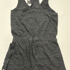 Dark gray romper with white drawstring. Nike logo on front. Comfortable and stylish.