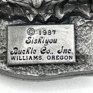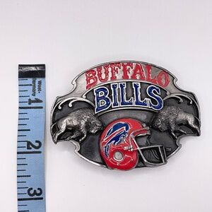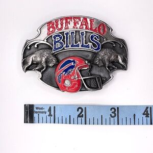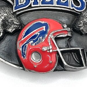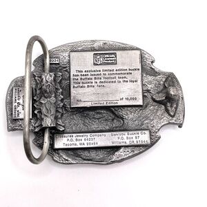 Vintage 1987 Buffalo Bills pewter collectible belt buckle by Siskiyou Buckle Co. in Williams, OR. Limited edition -- #7797 of 10,000 issued. Red and blue enamel highlight the helmet and the Buffalo Bills letters. Enamel is in excellent condition as is the entire buckle. It's weighty. See photos for size.